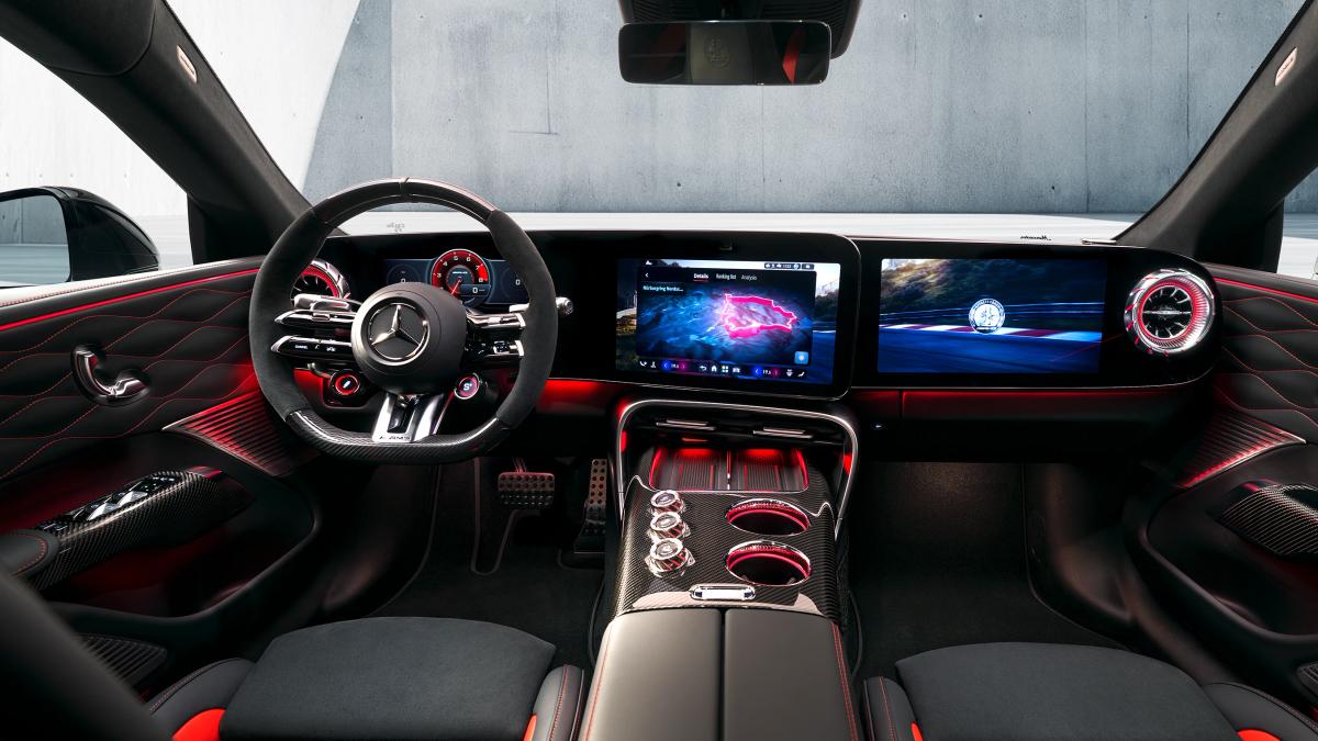 In the rear, however, the focus is on Gran-Turismo qualities: two intelligently designed recesses in the floor provide passengers with generous legroom and comfortable knee angles, offering a high level of long-distance comfort. The dynamic interior concept skilfully combines elements and structures from motorsport with a digital cockpit setting new standards, a driver-oriented central display and a uniquely designed centre console. In short, it has everything you would expect from an in-house development from Affalterbach.